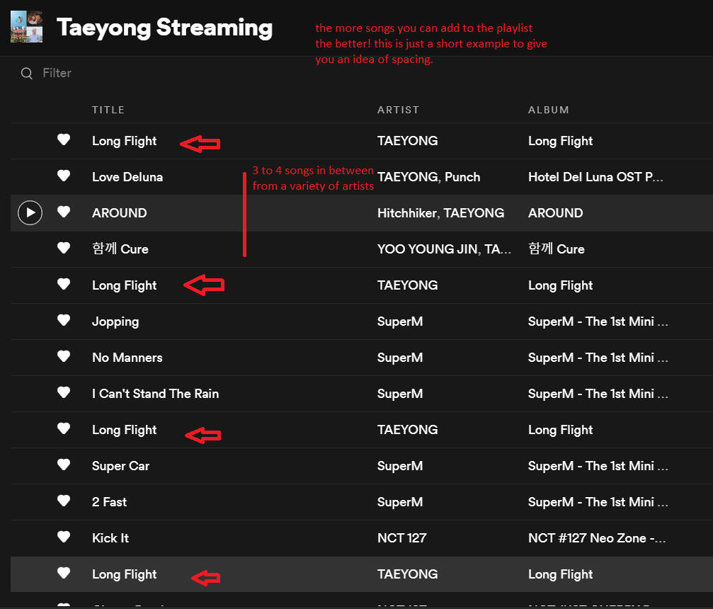 ღ Playlists should also include variety and be spaced out so no chart manipulation is detected. Please refer to a sample playlist below. When making the playlist spotify will ask you if you wish to add the duplicate song, make sure to hit 'add anyway'.