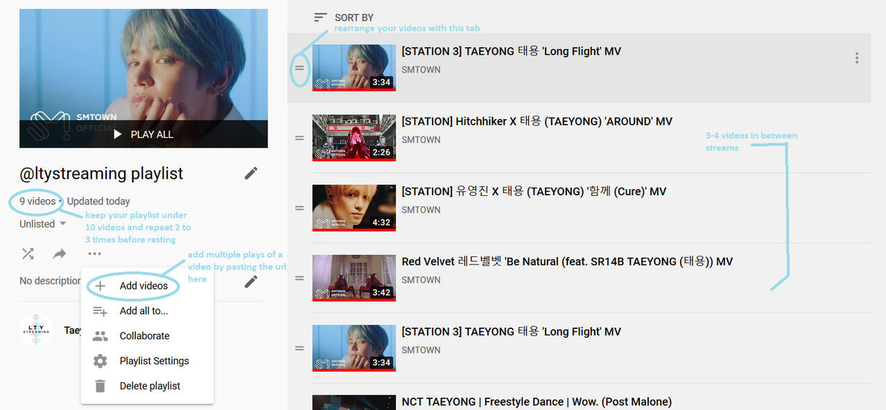 ღ Ayrıca çalma listenize farklı YouTube kanalları tarafından paylaşılmış videoları eklemek de iyi bir seçenek olur. (Örnek: Sadece SMTOWN veya NCT 127 kanallarından videolar koymayın, Deaser ya da KBS gibi kanallardan Taeyong ile ilgili videolar/fancamler dahil edin.)